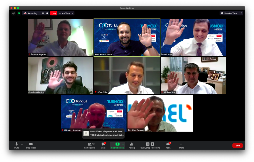 TÜSMOD CPO Türkiye dijital konferansların üçüncüsü 16 Temmuz 2020’de “Yeni Normalde Lokomotif Sektörlerin Yerli ve Millileşmedeki Öncü Rolü” başlığı ile düzenlendi. Açılış konuşmasını TÜSMOD Yönetim Kurulu Başkanı Gürkan Hüryılmaz’ın yaptığı konferansın moderatörlüğünü Ekspoturk CEO’su B. Kemal Şahin ile Medipol Sağlık Grubu Satınalma ve Tedarik Grup Müdürü İsmail Hızlı yaptı. 500’e yakın katılımcının izlediği Konferansta konuşmacı olarak Abdi İbrahim Tedarik Zinciri ve Satınalma Direktörü Ufuk Güler, ASELSAN Sanayileşme ve Tedarik Direktörü Ali Rıza Kılıç, TÜLOMSAŞ Ar-Ge Dairesi Başkanı İbrahim Erşahin, Karel Bilgi ve İletişim Teknolojileri Mühendislik Direktörü Dr. Alper Sarıkan ve Jetract CEO’su Onurhan Öztürk yer aldı.