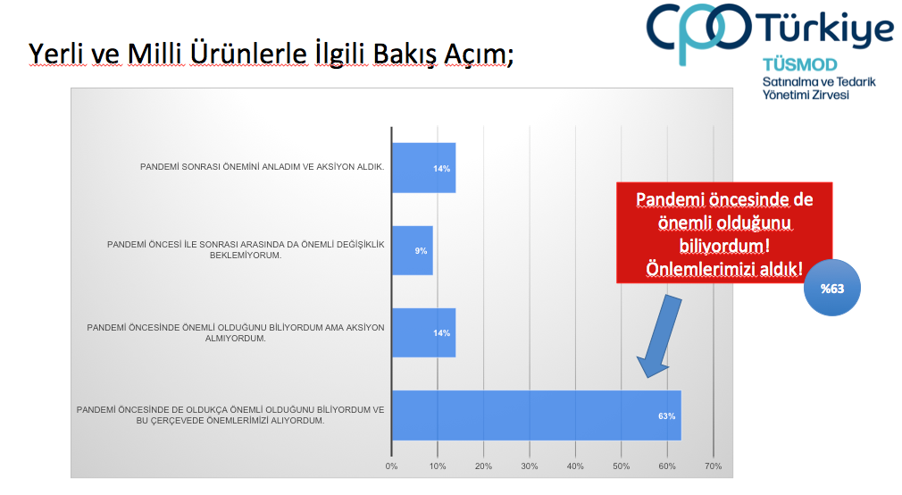 Yerli ve milli ürünlerle ilgili bakış açısı sorulan TÜSMOD CPO Türkiye dijital konferansı katılımcılarının yüzde 77’i pandemi öncesinde de önemini zaten bildiklerine yönelik seçenekleri işaretledi. Bunların yüzde 63’ü bu nedenle zaten önlemlerini almakta olduklarını belirtirken yüzde 14’ü ise önemini bildiklerini ancak aksiyon almamış olduklarını kaydetti. Katılımcıların yüzde 9’luk kesimi ise yerli ve milli konusunda pandemi sonrası herhangi bir değişiklik beklemediğini belirtti.