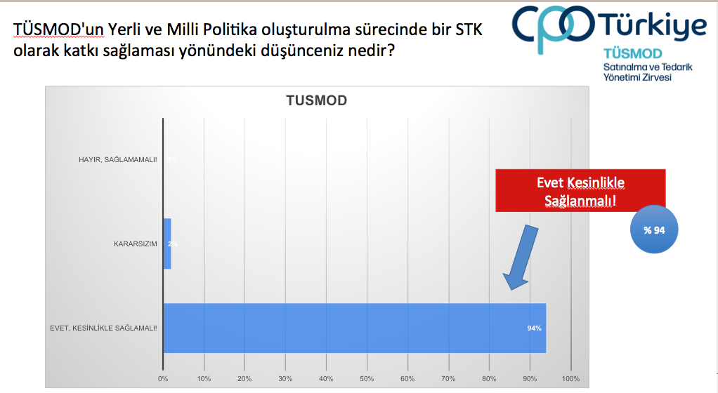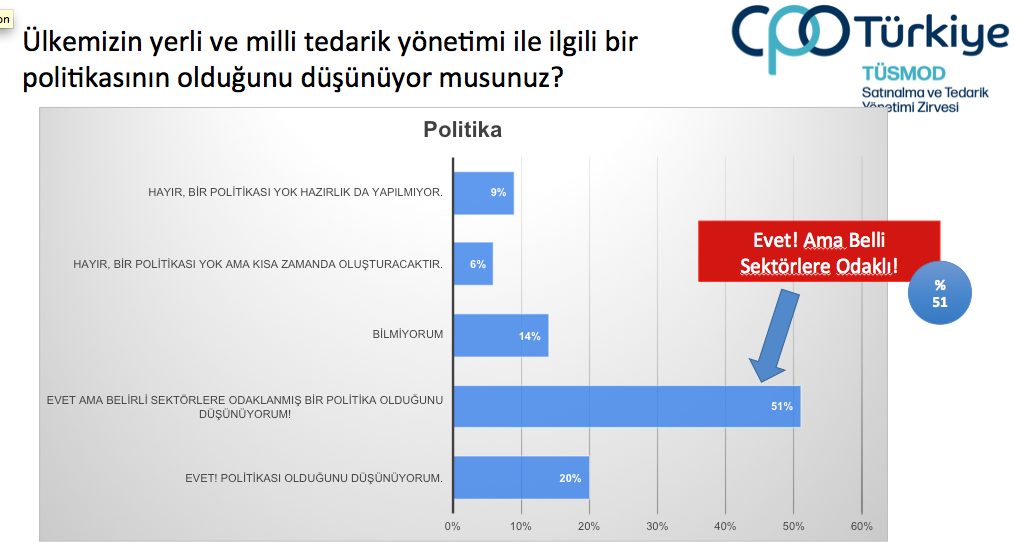 Türkiye’de yerli ve milli tedarik yönetimi ile ilgili bir politikanın olup olmadığı sorulan katılımcıların yüzde 71’i bir politika olduğu yönünde seçenekleri işaretlerken bunların yüzde 51’i politika olmakla birlikte belirli sektörlere odaklanılmış olduğu yönünde seçeneği işaretledi.